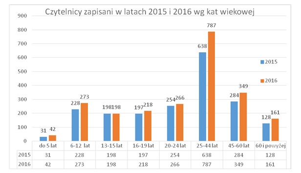 Czytelnicy w wieku 60 lat i powyżej – na koniec 2015 r. było 128, a do końca 2016 listopada jest 161 – wzrost o 33 osoby.