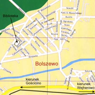 Miejscowość Bolszewo znajduje się na trasie Gdańsk-Szczecin, 3 km od Wejherowa. Aby dojechać do biblioteki, będąc już w Bolszewie, należy kierować się na miejscowość Żelazno. Koło pętli autobusowej znajdującej się przy lesie, skręcić w lewo w ulicę Leśną. Po przejechaniu ok. 1 km po lewej stronie widoczne będzie Samorządowe Gimnazjum, w budynku którego mieści się biblioteka. Wejście do biblioteki znajduje się w tyle budynku, po jego lewej stronie. Dojazd do Gimnazjum jest możliwy także autobusem MZK Wejherowo linii nr 1.