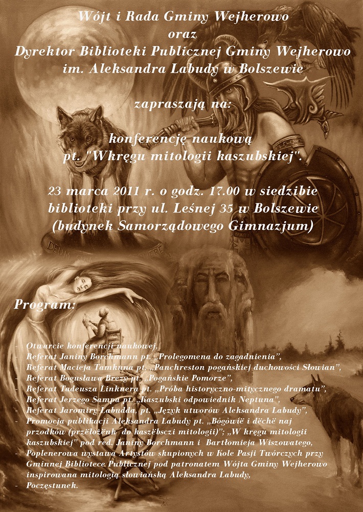 oraz Dyrektor Biblioteki Publicznej Gminy Wejherowo im. Aleksandra Labudy w Bolszewie zapraszają na konferencję naukową pt. "W kręgu mitologii