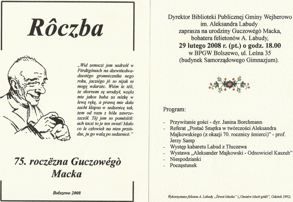 Dyrektor Biblioteki Publicznej Gminy Wejherowo im. Aleksandra Labudy zaprasza na urodziny Guczowego Macka, bohatera felietonów A. Labudy, 29 lutego 2008 r. (pt.) o godz. 18.00 w BPGW Bolszewo.