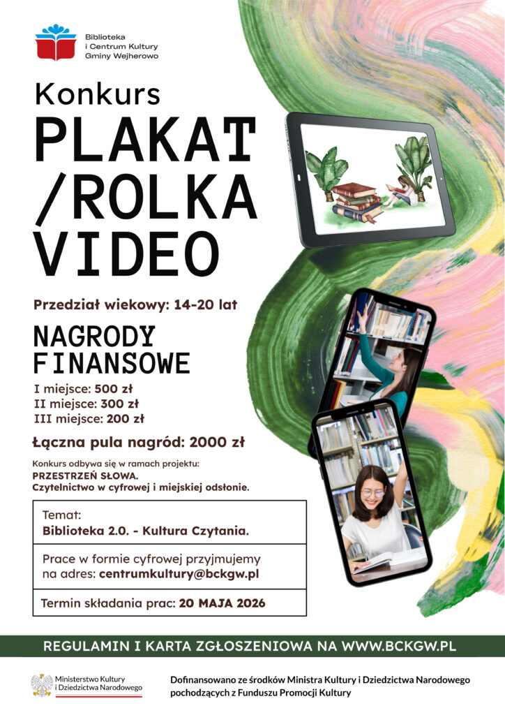 Stwórz plakat lub rolkę wideo na temat Biblioteka 2.0. – Kultura Czytania (Szczegóły w regulaminie) Pokaż, jak dzisiaj wygląda świat książek w cyfrowym wydaniu!
